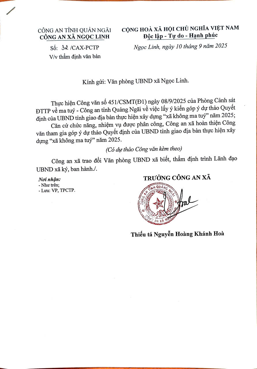 | Tiêu đề văn bản | Công văn tham gia góp ý dự thảo Quyết định của UBND tỉnh giao địa bàn thực hiện xây dựng "xã không ma tuý" năm 2025 | ||